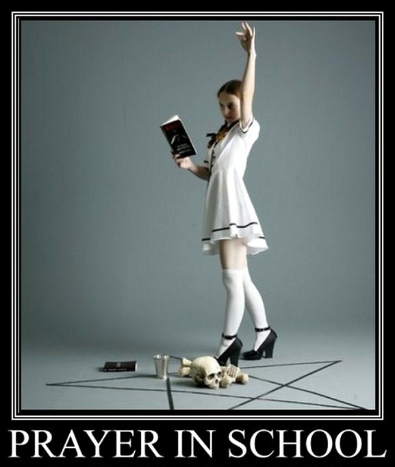 Okay. So which religion has such blanket transformative power? Remember, in public schools, all religions by law would enjoy equal favor. Most religious people in the U.S. belong to one of the many various branches of Christianity, so obviously Christian prayer would be included. What about a Jewish prayer? That should be okay – our Christian heritage is rooted in Judaism. Would parents welcome Islamic prayer in this political climate? Moreover, required school prayer would also legitimize atheism, Wiccan, and even Satanism, giving them a seat at the school-prayer altar. Do we really want our kids to pray “Dear God” on Monday and “Dear Satan” by Friday?